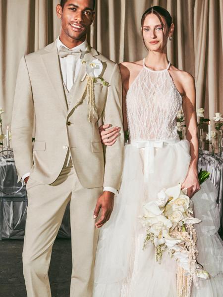 • Le costume de mariage moderne slim fit : Pour les hommes à la recherche d'un look plus contemporain, nos costumes slim fit offrent des coupes ajustées qui soulignent la silhouette. Ce style est souvent choisi par les mariés qui souhaitent un costume tendance, disponible en diverses teintes pour correspondre à votre thème de mariage.